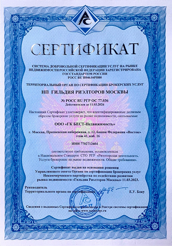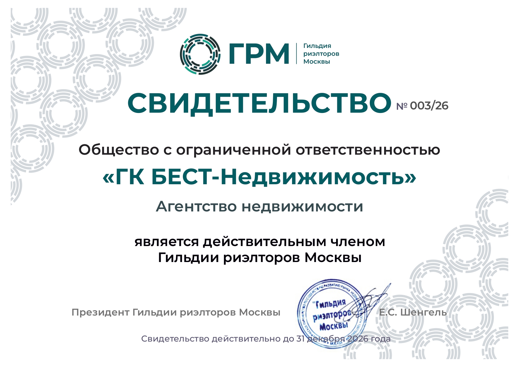 Наше агентство является членом Российской Гильдии Риелторов. По версии международного исследовательского центра MARC, "БЕСТ" входит в пятерку крупнейших риелторских агентств в Москве. Мы опираемся на более чем 25-летний опыт работы и предлагаем клиентам выгодные условия сотрудничества: