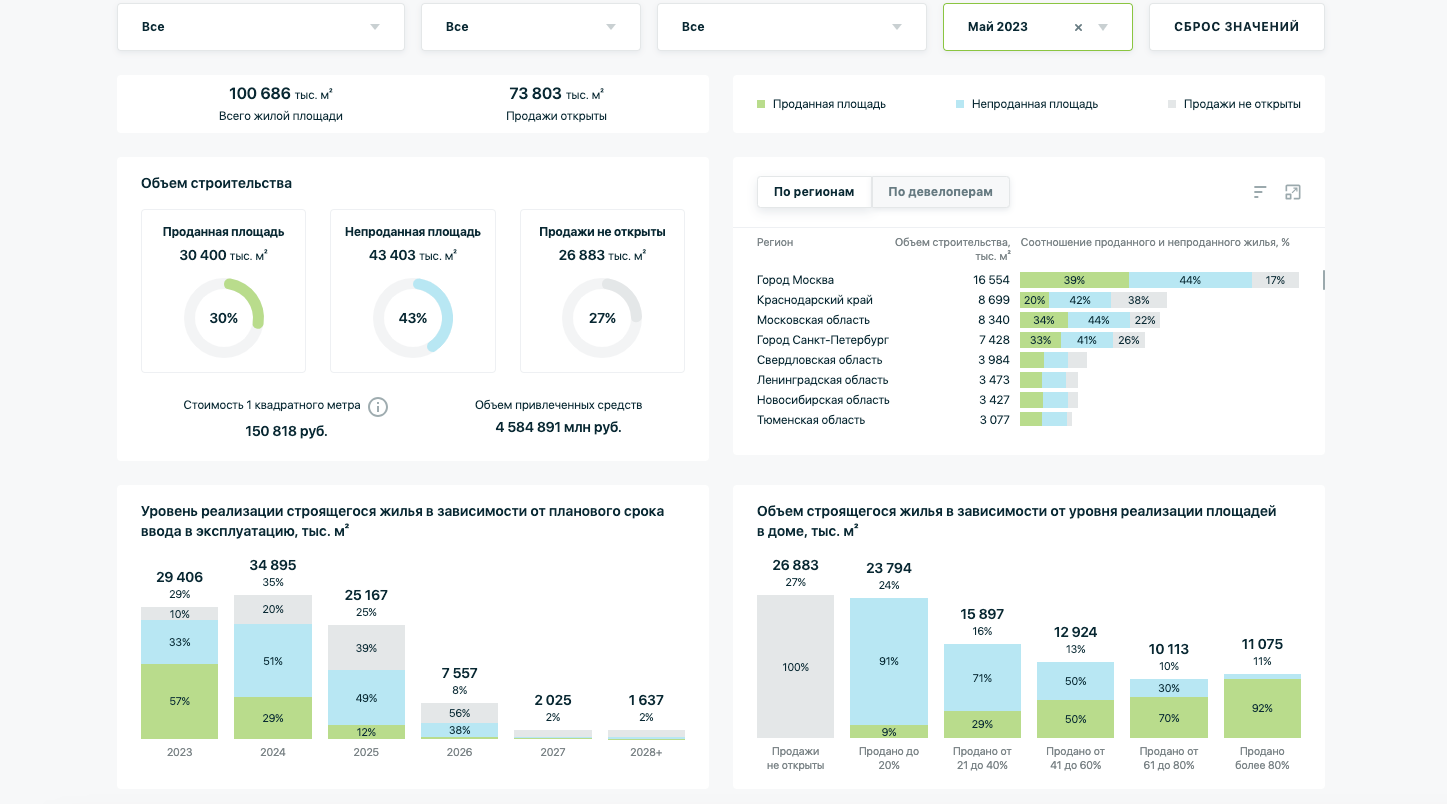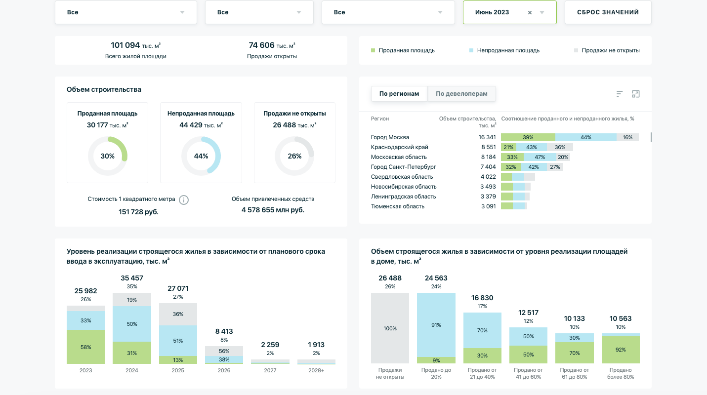 Кстати, срок реализации непроданного строящегося жилья в России на данный момент составляет около 29 месяцев. В прошлом квартале данный показатель равнялся 34 месяцам. Быстрее всего жильё продаётся в Сибири и на Урале, а медленнее всего - в Северо-Западном и Южном федеральных округах.