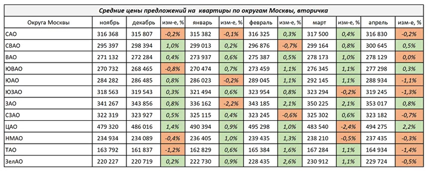 Изменение цен на квартиры по округам Москвы с ноября 2023 г. по апрель 2024 г