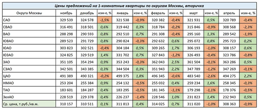 В сегменте 1-комнатных квартир в апреле изменение цен было разнонаправленным. Лидером роста был ЦАО (+2,2%). Более всего снизились цены в СВАО (-2,3%) и ВАО (-1,9%).