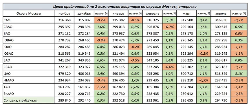Изменение цен на 2-комнатные квартиры по округам Москвы с ноября 2023 г. по апрель 2024 г.