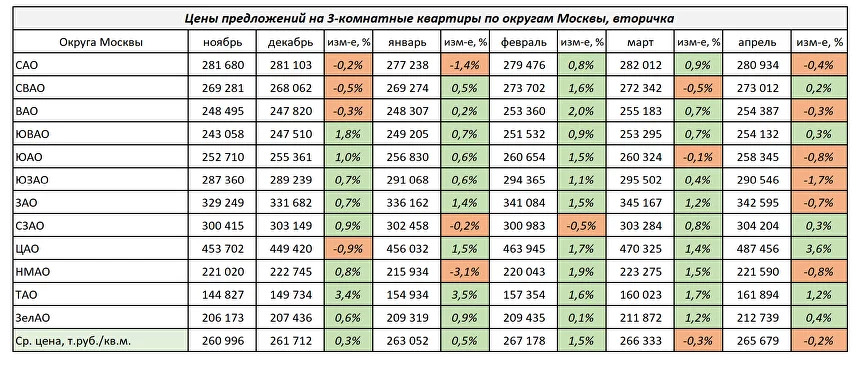 Средние цены предложений на 3-комнатные квартиры показаны в таблице ниже: