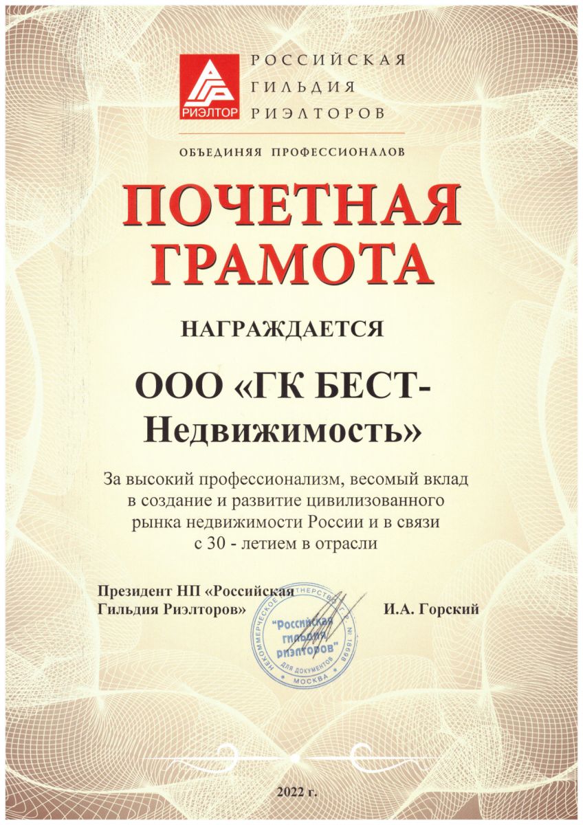 За время своего существования компания “БЕСТ-Недвижимость” была отмечена множеством наград. К своему 30-летию мы получили очень ценную для нас почётную грамоту Российской Гильдии Риэлторов за высокий профессионализм и вклад в создание и развитие цивилизованного рынка недвижимости России. Эта награда подтверждает достижение и выполнение задач компании, поставленных со дня её основания.